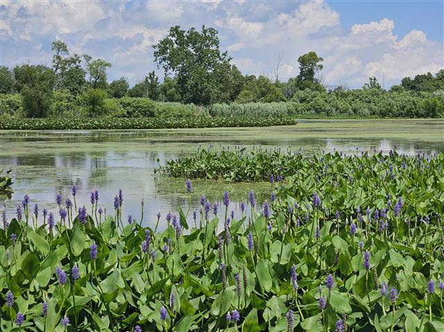 Jim loved the outdoors and was especially fond of Hillman Marsh. After the tree dedication we went for a walk to the marsh area. On the way to the boardwalk, in the tall grass there were many flowering plants and monarch butterflies fluttering about. The photo below shows the aquatic plant, Pickerelweed in full bloom that day. We spotted several shorebirds in the distance, particularly a rare Black-Crowned Night Heron. As well, close to where we were standing, we observed a very large snapping turtle.