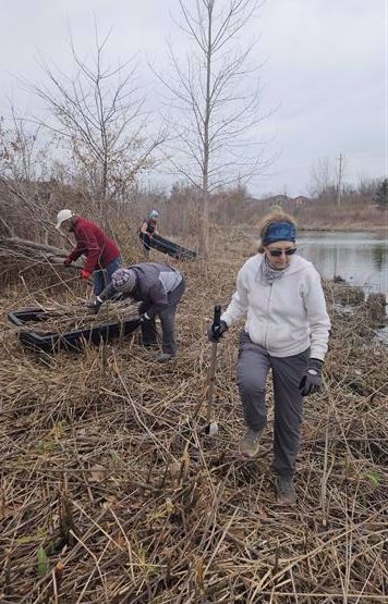 The Phrag Fighters have been working hard at Blue Heron Pond. In September, the City of Windsor sprayed all the invasive phragmites on land. Our Phrag fighters have been cutting all the dead material and bringing it up to the sidewalk around the pond. The City will remove the piles. I would say the pond is about half done and is looking great. The areas cleaned of phrag can now make room for native plants.