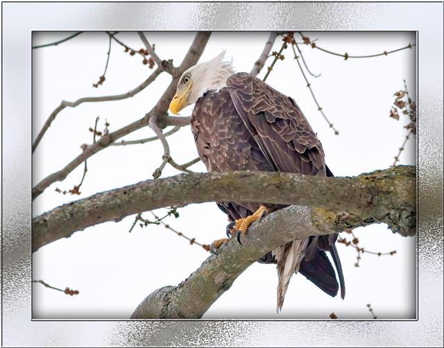 By this time the dogs were engaged in their own version of mortal combat so I proceeded to bring them into the house. By the time I returned outside the eagle had departed so I went to pick up whatever had fallen. Much to my amazement it turned out to be a somewhat frozen slice of raw bacon! The next day I saw an eagle again a few backyards down the street perched in another tall tree. Maybe a neighbour had decided to feed some kind of wildlife and had attracted an unexpected visitor.